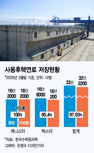 이후엔 캐니스터와 맥스터 같은 건식저장시설로 옮긴다. 캐니스터 한 기마다 540다발씩 총 16만2000다발의 사용후 핵연료가 들어차 있다. 캐니스터는 이미 2010년 포화됐다. 이후 발생한 사용후핵연료는 맥스터에 보관 중이다. 모두 7모듈이 있는데 1모듈에 사용후핵연료 600다발이 담긴 실린더 40개, 총 2만4000다발이 보관된다. 7모듈 총 저장용량은 16만8000다발인데 이미 95.4%인 16만200다발이 찼다. 캐니스터까지 합친 포화율은 97.63%에 달한다. 한국방폐학회가 사용후핵연료 관리정책 재검토위원회 의뢰를 받아 계산한 결과로는 2022년 3월이면 포화상태가 된다.