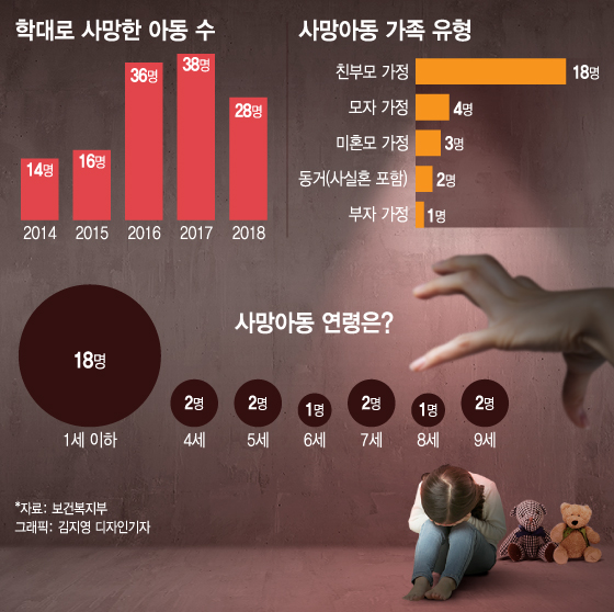 최근 5년(2014~2018년)간 아동학대로 숨진 아동은 총 132명이었다. 2014년 14명이던 사망 아동 수는 2015년 16명, 2016년 36명, 2017년 38명으로 증가해왔다.