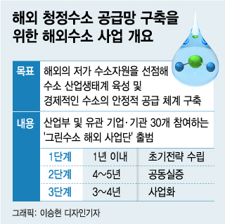 정부가 2030년까지 청정수소를 호주, 아랍에미리트(UAE) 등 값싼 수소자원이 풍부한 해외에서 생산해 국내로 들여오는 방안을 추진한다. 정부를 비롯해 민간기업과 공기업, 연구기관 등 30곳이 함께하는 초대형 민관협력 프로젝트다. 안정적인 해외 공급망을 구축해 폭발적으로 성장할 수소 수요에 대응하고 생산부터 저장·운송, 활용까지 국내 수소 산업 생태계를 강화하기 위한 전략이다.