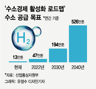 수소차 보급 확대로 국내 연간 수송용 수소 수요량은 올해 4000톤에서 2030년 약 37만톤, 2040년 약 100만톤까지 늘어날 것으로 예상된다. 철강·화학 등 산업계 수소 활용이 늘어날 경우 수소 공급의 중요성이 더욱 커질 전망이다. 정부는 지난해 1월 발표한 '수소경제 활성화 로드맵'에서 현재 연간 13만톤인 수소 공급량을 2022년 47만톤, 2030년 194만톤, 2040년 526만톤까지 늘린다는 목표를 제시하기도 했다.