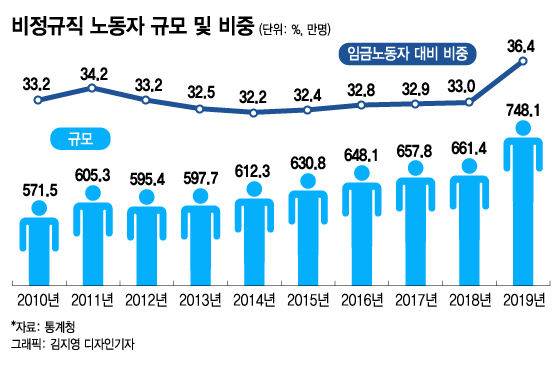지난해 비정규직 노동자 수는 748만1000명으로 2017년보다 90만3000명 증가했다. 거칠게 보면 같은 기간 공공부문 비정규직은 20만명 줄었으나 민간 등 다른 부문은 110만명 늘었다고 해석할 수 있다. 정부는 기간제 노동자 35만~50만명이 새로 포착된 점을 감안해야 한다고 했다. 하지만 이를 제외하더라도 비정규직은 40만명 증가했다.