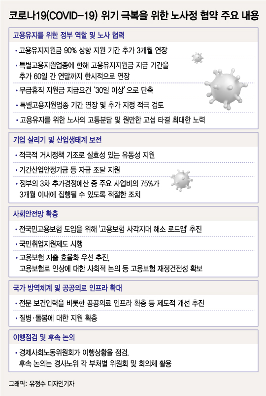 노사정 협약안은 앞서 지난 3월 경사노위가 발표한 '코로나19 확산에 따른 위기를 극복을 위한 노사정 선언'과도 크게 다르지 않다. 노사정 선언은 사측이 고용 유지에 노력하고, 노측이 대규모 집회를 자제하고 임·단협 시기를 탄력적으로 조절하기로 했다.