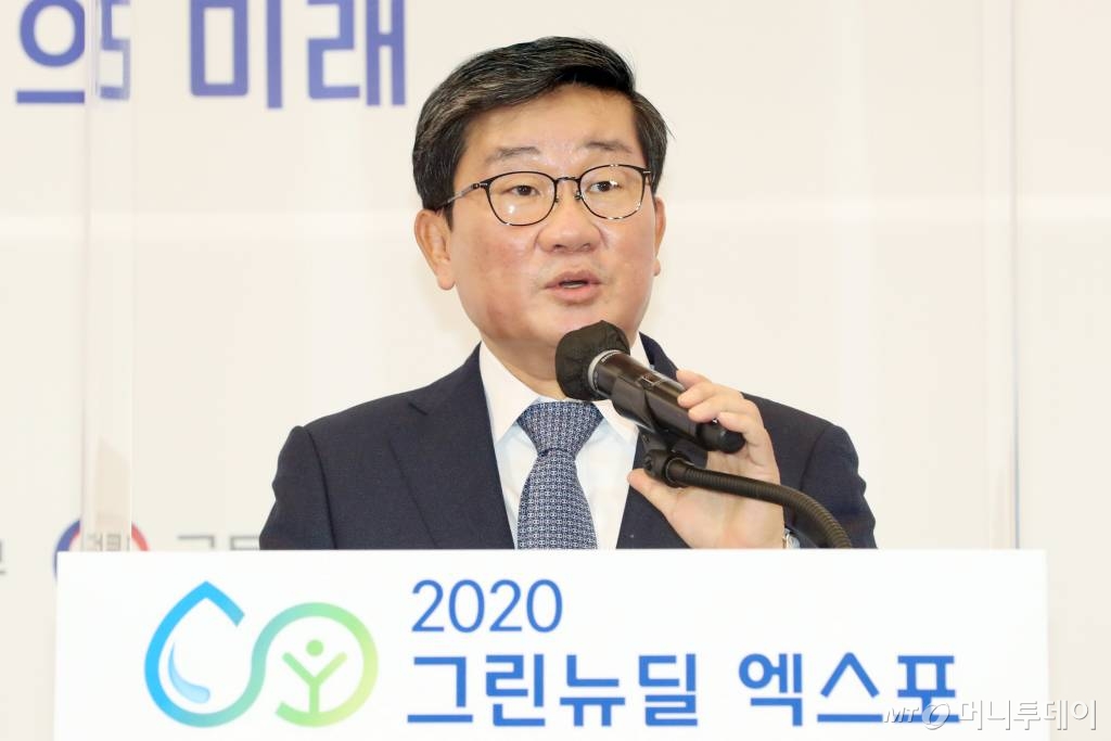 국회 수소경제포럼 대표의원인 전해철 더불어민주당 의원이 28일 오후 서울 동대문디자인플라자(DDP)에서 열린 '2020 그린뉴딜 엑스포' 축사 도중 참석자들에게 박수를 '요청'했다. 이날 문 대통령이 2021년도 예산안에 대한 국회 시정연설에서 '2050년 탄소중립 선언'을 하자 본회의장에서 터져나온 '8초 기립박수'를 재연한 것이다.