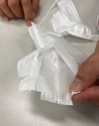 기다랗게 들어가는 세 재료가 만나, 1초에 하나씩 '툭'. 처음 본 기계에선,마스크가 그리 질서 있게 튀어나왔다. 귀에 거는 끈까지 더해지니 완성. 그러자 파란 장갑을 낀 작업자 세 명이 부지런히 마스크를 모았다. 분주해 보였다.