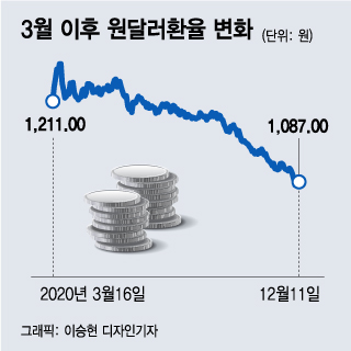 안동현 서울대학교 경제학과 교수는 "미국이 2018년부터 2014년까지 양적완화로 푼 돈을 이번에는 3개월 만에 다 풀면서 달러가 약세로 돌아섰고, 백신개발 소식에 투자자들의 위험감내 수준이 높아졌다"며 "경기가 가장 빨리 회복되는 한국, 중국으로 자금이 많이 유입되면서 원화가 강세를 보이고 있다"고 밝혔다.