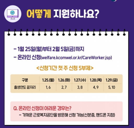 ▶근로복지서비스 홈페이지(welfare.kcomwel.or.kr/CareWorker.jsp, PC만 가능)에서 온라인으로만 신청할 수 있다. 오는 29일까지는 신청자 본인의 출생연도 끝자리에 따라 지정된 요일에만 신청이 가능하다. 30일 이후부터는 자유롭게 신청할 수 있다.