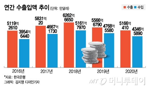 특히 수출은 상반기 글로벌 생산차질과 수요위축에 따라 5166억달러로 전년대비 400억7000만달러 감소했다. 4분기부터 반도체 등을 중심으로 전년동기대비 40.1% 급증했지만 연간 하락폭을 상쇄하지는 못했다. 수입은 4346억6000만달러로 422억달러 감소했다. 박양수 한은 통계국장은 "수입의 가장 큰 감소 원인은 국제유가 등 원자재 가격 하락의 요인이 가장 컸다"고 설명했다.