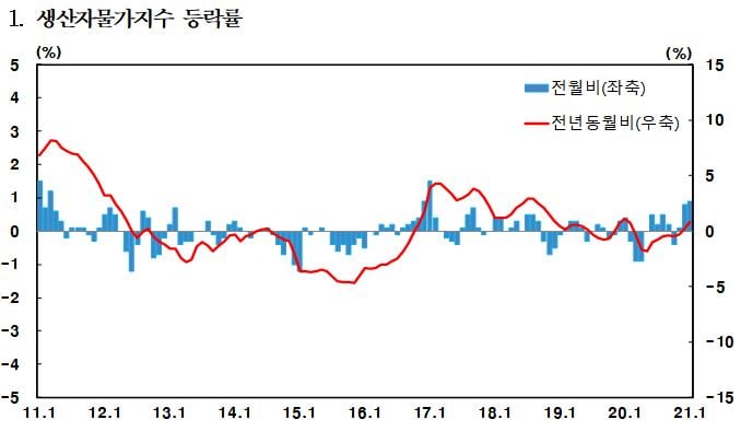 21일 한국은행에 따르면 1월 생산자물가지수(2015년 100 기준)는 전월대비 0.9% 상승한 104.88을 기록했다. 3개월째 상승세다. 전년동기대비로도 0.8% 오르며 2개월 연속 상승세를 기록했다. 생산자물가지수는 국내 생산자가 공급하는 상품과 서비스 가격변동을 측정하는 지표다. 유통과정을 거치며 시차를 두고 소비자물가에도 반영된다.