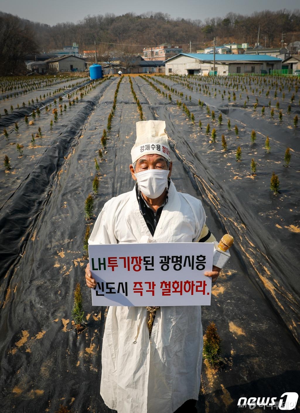 (시흥=뉴스1) 안은나 기자 = 10일 한국토지주택공사(LH) 직원들이 사들인 경기 시흥 과림동 소재 농지에서 공공주택지구 전국연대대책협의회(공전협) 긴급 기자회견을 마친 한 참가자가 상복을 입은 채 신도시 철회를 촉구하고 있다. 공전협은 LH 직원들의 3기 신도시 토지 투기를 규탄하며 신도시 백지화와 공공주택특별법 폐지를 촉구했다. 2021.3.10/뉴스1