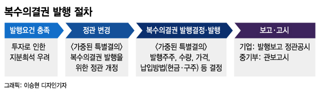 또 감사와 감사위원의 선임·해임, 이익배당, 자본금의 감소, 해산의 결의, 이사의 보수, 복수의결권 존속기간 변경을 위한 정관 변경 등 주요사안에 대해선 1주당 1의결권으로 복수의결권 행사를 제한한다. 아울러 투명성을 확보하기 위해 복수의결권 발행기업은 중기부에 보고하고, 발행내용 공시와 함께 관보에도 고시하도록 했다.