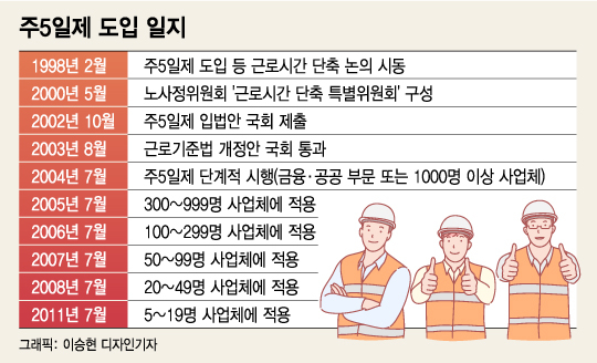 2004년 주5일제가 단계적으로 시작될 때도 논란이 적지 않았다. 생산성 저하 우려가 가장 컸다. 하지만 주5일제가 안착하면서 생산성 우려는 어느 정도 해소됐다.