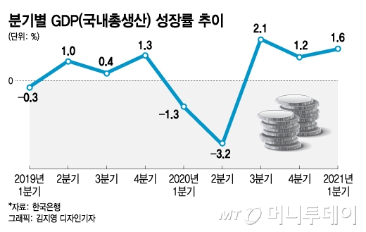 문 대통령의 발언이 나온 날은 한국은행이 올해 1분기 GDP(국내총생산) 성장률을 발표한 날이다. 한은에 따르면 1분기 GDP는 470조8467억원으로 전기대비 1.6% 증가했다. 그 결과, 우리 경제는 지난해 코로나19로 인한 충격을 상쇄하고, 코로나 이전인 2019년 4분기의 GDP 468조8143억원을 뛰어넘었다. 코로나의 터널을 벗어났다는 문 대통령의 말은 틀린 건 아니다.