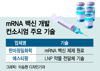 국산 코로나19(COVID-19) mRNA(메신저RNA) 백신 개발과 생산을 위한 'K-바이오 연합군' 진용이 갖춰졌다. 한미사이언스(38,050원 ▼450 -1.17%)와 에스티팜 등 기반 기술을 갖춘 업체들이 컨소시엄을 구성해 mRNA 백신 기술자립에 나서기로 한 것. 정부도 이들의 백신 개발에 대규모 지원을 검토중인 것으로 알려졌다. 미국 정부의 전폭적 지원 하에 진행된 모더나식 백신 개발 모델이 한국에서 가동될지 주목된다.