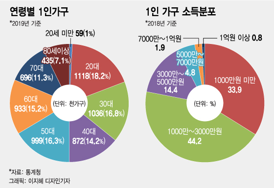 이는 저소득층과 고령층이 많은 1인 가구의 특성 탓입니다. 1인 가구라고 하면 미디어에 나오는 화려한 2030을 떠올리기 좋지만 60대 이상 가구가 전체의 3분의 1 이상을 차지하는 게 현실입니다.