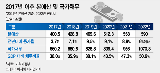 정부가 2022년도 예산 지출 증가율을 6% 이하로 줄이려는 배경에는 문재인 정부 출범 이후 과도하게 늘어난 씀슴이와 나랏빚을 줄여야 한다는 인식이 깔려있다. 현 정부 출범 4년만에 예산은 157조원 이상, 국가채무는 295조원이상 증가했다. 국가채무의 적절성을 따지는 지표인 GDP(국내총생산) 대비 국가채무비율은 36%에서 47.3%로 11.3%포인트 급등했다.
