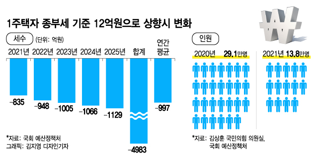 1주택자 종합부동산세 과세 기준을 현행 9억원 이상에서 12억원 이상으로 높이면 5년간 5000억원 가까운 세수가 줄어든다는 분석이 나왔다. 이 경우 종부세 납부인원은 약 14만명으로 절반 넘게 줄어든다.