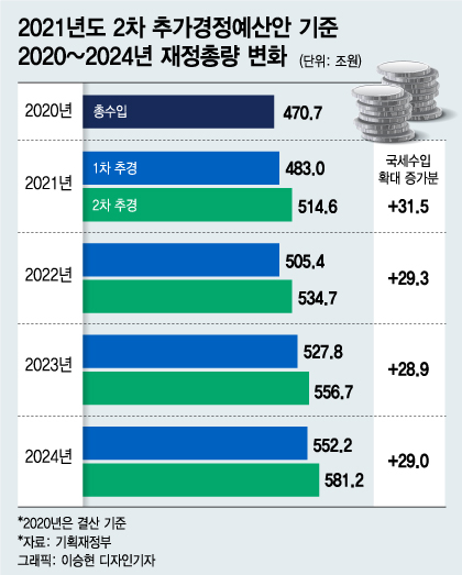 4일 정부가 국회에 제출한 2021년도 2차 추경안 부속서류에 따르면 올해 국세수입 확대분은 31조5000억원, 총수입은 514조6000억원이다. 정부는 이번 추경에서 올해 세수전망 수정에 따라 2024년까지 중기재정전망도 바꿨다. 2022년에는 국세수입이 29조3000억원, 2023년에는 28조9000억원 증가할 것으로 내다봤다. 2024년 증가하는 국세수입은 29조원이다. 이에 따라 총수입도 각각 △2022년 534조7000억원 △556조7000억원 △581조2000억원으로 증가한다.