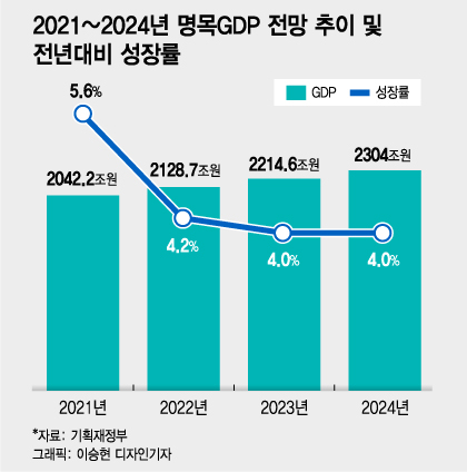 2021년 명목 GDP는 2042조2000억원으로 1차 추경 전망에 비해 38조5000억원 상향조정했다. △2022년 2128조7000억원 △2023년 2214조6000억원 △2024년 2304조원 등이다. 올해 4.2% 성장에 이어 2024년까지 4% 성장을 가정한 결과다.