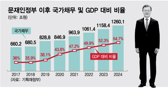 26일 기획재정부에 따르면 2017년 660조2000억원이던 국가채무는 올해 963조9000억원으로 늘었다. 같은 기간 GDP(국내총생산) 대비 국가채무비율은 36%에서 47.2%로 높아졌다. 2024년에는 국가채무가 1260조1000억원에 달하고 국가채무비율은 54.7%를 기록할 전망이다.