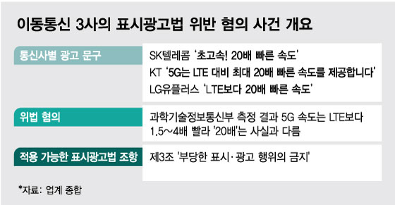공정위는 이통3사가 5G 서비스에 대해 LTE보다 20배 빠르다는 취지로 광고한 것을 놓고 허위·과장성이 있는지 집중적으로 들여다보고 있다. 소비자주권시민회의에 따르면 △SK텔레콤은 "초고속! 20배 빠른 속도" △KT는 "5G는 LTE 대비 최대 20배 빠른 속도를 제공합니다" △LG유플러스는 "LTE보다 20배 빠른 속도" 등의 표현으로 광고했다.