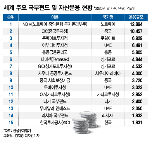 코로나19(COVID-19)가 전 세계를 집어삼킨 지난해 우리나라는 GDP(국내총생산) 규모에서 브라질을 제치고 세계 10위권에 재진입했다. 외환보유액은 세계에서 8번째로 많다. 그러나 KIC(한국투자공사)의 운용자산 규모는 전 세계 국부펀드 가운데 15위에 그친다. 홍콩과 비교해도 3분의 1에 불과하다.