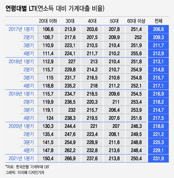 올해 1분기 LTI를 연령별로 살펴보면 30대가 266.9%로 전 연령대에서 가장 높았다. 연봉의 3배에 가까운 대출을 짊어지고 있다는 의미다. 1분기 기준으로 30대의 LTI는 2017년 213.9%, 2018년 227%, 2019년 234.7%, 2020년 244.4%로 가파른 상승세를 보였다.