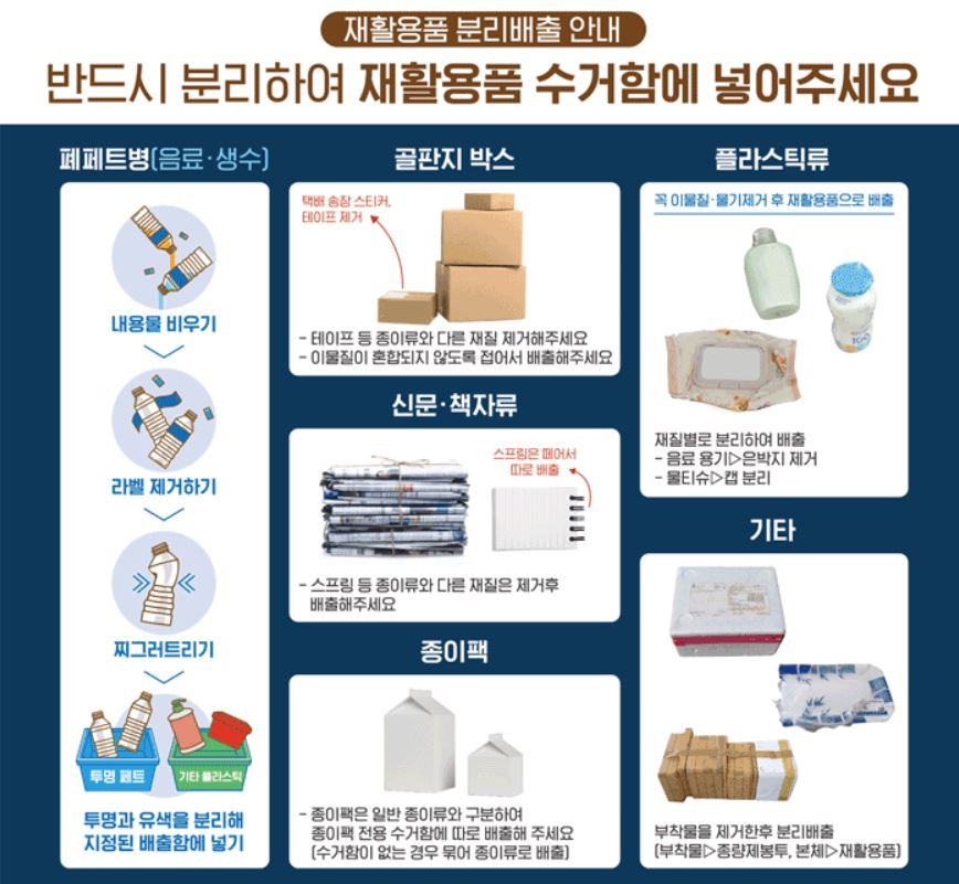 그러나 한 번이라도 분리수거장에 다 쓴 페트(PET)병을 버려본 사람이라면 폐기물을 버리는게 간단치 않은 작업이라는 것을 느끼게 된다. 자원을 실제로 다시 쓸 수 있도록 재활용 방법을 강화한 때문이다. 종량제 봉투 사용량을 줄여 가계에 보탬이 되기 위해서라도 재활용 폐기물을 버리는 바른 방법을 아는 것은 중요하다. 또 기껏 고생해 버린 재활용 폐기물이 실제로 재활용 될 수 있도록 하기 위해서도 숙지할 필요가 있다.