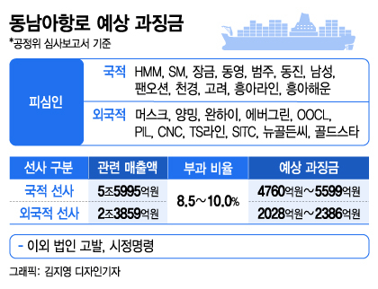 공정위는 HMM, SM, 장금 등 12개 국적 선사에는 4760억∼5599억원, 머스크, 양밍, 완하이, 에버그린 등 11개 외국적 선사에는 2028억∼2386억원의 과징금을 부과해야 한다는 의견을 냈다.