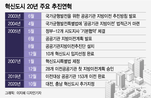 공공기관 지방 이전의 시작은 18년 전으로 거슬러 올라간다. 노무현 정부는 2003년 국가균형발전을 위한 공공기관 지방 이전 추진 방침을 밝혔고, 이듬해 관련 근거를 담은 국가균형발전특별법(이하 균특법)이 시행됐다. 2007년 말 한국토지주택공사(LH) 등의 지방 이전 승인을 시작으로 2019년 말까지 총 153개 공공기관이 지방에 자리를 잡으면서 1차 이전이 마무리됐다.