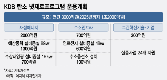 정부는 내년 예산 가운데 1500억원을 3000억원 규모의 정책금융 사업인 'KDB 탄소 넷제로 프로그램'(이하 넷제로 프로그램)에 출자키로 했다. 산은이 주관하는 넷제로 프로그램은 정부의 '2050 탄소중립 추진 전략'과 연계해 초기 단계 혹은 고위험 녹색 사업의 투자 지원을 위해 마련됐다.