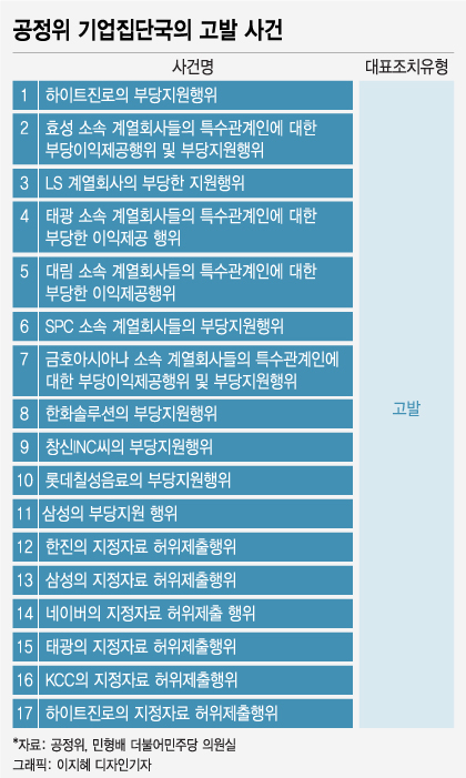 이 밖에 온라인 사건처리시스템-의결서에 따르면 계열사 공시 등 지정자료를 허위제출해 공정위가 고발한 사건은 △한진 △삼성 △네이버 △태광 △KCC △하이트진로 등 6건으로, 모두 기업집단 총수가 고발됐다.