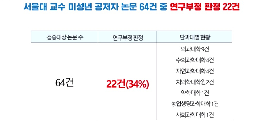 이에 대해 오 총장은 "이것은 저도 처음 보는 자료"라고 답했다. 앞서 서울대 연구진실성위원회는 미성년 공저자 논문 64건 가운데 22건이 연구부정이라고 판정했고, 연구부정 22건의 논문에 이름을 올린 미성년 공저자는 24명으로 조사됐다.