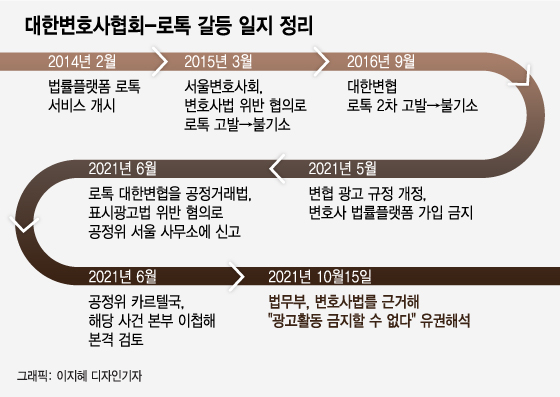 변협은 지난 5월 변호사 광고 규정을 개정, 로톡을 통한 변호사들의 광고를 전면 금지하기로 결정했다. 이에 로톡은 6월 공정위에 변협이 사업자단체 금지행위 등 공정거래법을 위반했다고 신고했다. 이에 대해 변협은 광고 금지행위는 변호사법에 따라 소속 변호사들을 감독하는 것으로 공정거래법의 적용을 받지 않는다고 주장해왔다.