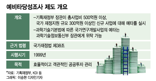 정부는 지난 1999년 효율적이고 객관적인 공공투자 관리를 목적으로 예타 제도를 처음 도입했다. 관련 법률인 국가재정법에 따르면 총사업비가 500억원 이상이고 국가의 재정지원 규모가 300억원 이상인 신규 사업이 원칙적으로 예타 대상이 되며, 예타 수행의 주체는 기재부 장관이다. 다만 과학기술기본법에 따라 국가 연구개발(R&D) 사업의 예타는 기재부 장관이 과학기술정보통신부 장관에게 위탁할 수 있다.