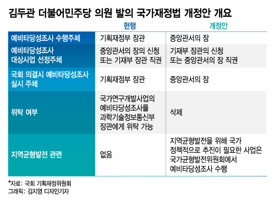 국회의 문제 의식은 지난해 김두관 의원이 발의한 국가재정법 개정안을 통해 읽을 수 있다. 김 의원은 개정안에서 "다양한 분야의 국가사업에 대해 기재부 장관이 일률적으로 예타를 실시해 사업의 진행 여부가 비용·편익 분석과 같은 경제적 효율성 측면에 의해 결정된다"며 "지역 간 균형, 형평성에 대한 고려가 부족하다는 의견이 있다"고 지적했다.