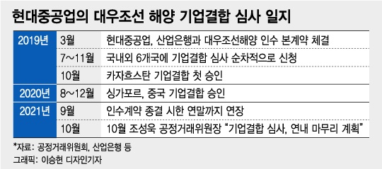현대중공업과 대우조선해양에 대한 기업결합 심사는 그동안 해외 경쟁당국과 함께 진행한 심사들에 비해서도 오래 걸린 편이다. 2019년 이후 공정위가 해외 경쟁당국과 동시에 기업결합 심사를 진행한 총 8건이 전체회의에 상정이 되는 데까지 걸린 기간은 평균 288일(약 10개월)이었다.
