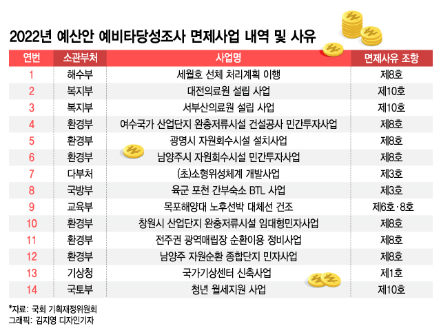 정부는 2022년 예산안에 예타 면제 사업 14건을 보고했다. 올해 7월 발표한 23조5000억원 규모 청년 대책에 포함된 청년 월세 지원사업을 시작으로 △세월호 선체 처리 이행계획△대전의료원 설립사업 △서부산의료원 설립사업 △여수국가 산업단지 완충저류 시설 건설공사 민간투자사업 등이 담겼다.
