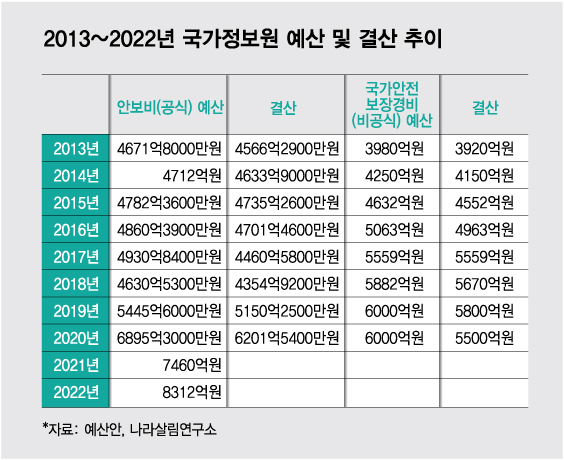 문재인 정부가 편성한 국정원의 안보비 예산은 △2018년 4631억원 △2019년 5446억원 △2020년 6895억원 △2021년 7460억원 △2022년 8312억원 등으로 5년 간 총 3조2743억원이었다. 연평균 6549억원 꼴이다.