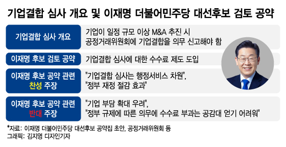 이재명 더불어민주당 대선후보가 공정거래위원회에 M&A(인수·합병)를 신고하는 기업에 수수료를 부과하는 방안을 공약으로 검토하고 있다. 미국 등 일부 해외 경쟁당국은 M&A의 독과점성 등을 따지는 기업결합 심사를 '행정서비스 제공' 차원으로 보고 기업으로부터 수수료를 받고 있는데, 국내에도 이를 도입하겠다는 것이다.