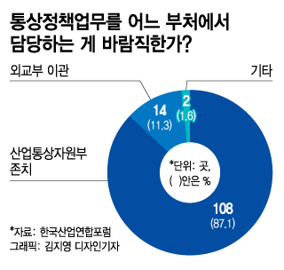 29일 주요 산업협회들의 모임인 한국산업연합포럼(KIAF)이 최근 기업들을 상대로 설문한 결과, 조사에 응한 수출제조업체 124곳 가운데 108곳(87.1%)이 "통상 기능을 현행 산업부에 둬야 한다"고 답했다. "통상 기능을 외교부로 옮겨야 한다"고 답한 기업은 14곳(11.3%)에 그쳤다. 나머지 2곳(1.6%)은 '기타' 답변을 골랐다.