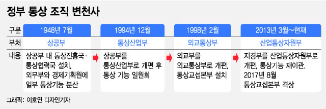 정부 통상조직의 변천사는 대한민국의 70년 발전사와 궤를 같이 한다. 일제강점기와 한국전쟁으로 폐허가 됐던 한국이 세계 10위의 경제대국으로 우뚝서기까지 수출과 수입 등 국제교역을 총괄하는 통상조직은 성장의 단계마다 여러 정부기능과 물리적, 화학적 결합을 거듭하며 역량을 키워왔다.