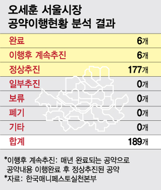 오 시장의 공약 추진 실행력은 일단 합격점을 받았다. 지난달 31일 한국매니페스토실천본부의 '시도지사 및 교육감 공약이행 및 정보공개 평가 결과발표'에 따르면 오 시장이 발표한 189개 공약은 모두 정상추진 중인 것으로 조사됐다. 지난해 말까지 이행 현황을 살펴보면 완료공약이 6개, 이행 후 계속 추진이 6개, 추진 중은 177개로 확인됐다. 공약 중 일부 추진, 보류, 폐기 등의 공약은 없었다.
