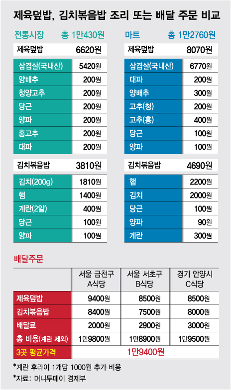 18일 머니투데이 기자들이 전통시장과 동네 마트에서 직접 식재료를 사서 제육덮밥과 김치볶음밥을 만들어 본 결과, 배달앱을 통해 주문하는 것보다 6000~9000원 가량 비용이 적게 드는 것으로 조사됐다. 배달앱의 경우 3곳 평균 가격이 배달비까지 포함해 1만9400원에 달한 반면 동네 마트와 전통시장에서 구매한 식재료 값은 각각 1만2760원, 1만430원에 그쳤다.