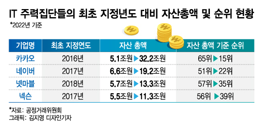 27일 공정거래위원회가 발표한 2022년도 공시대상기업집단 현황을 보면 최근 수년 사이 카카오, 네이버 등 IT 주력 대기업집단의 자산총액 증가가 두드러졌다.