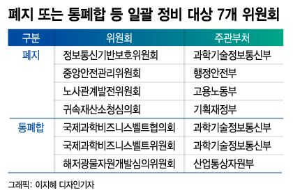 이번 정비 명단엔 △중앙안전관리위원회(행안부) △정보통신기반보호위원회(과학기술정보통신부) △노사관계발전위원회(고용노동부) △귀속재산소청심의회(기획재정부) △해저광물자원개발심의위원회(산업통상자원부) △국제과학비즈니스벨트협의회·국제과학비즈니스벨트위원회(과기부) 등이 올랐다. 중앙안전관리·정보통신기반보호·노사관계발전위원회와 귀속재산소청심의회는 폐지, 나머지 3개 위원회는 통폐합 대상이다. 이런 내용이 담긴 법률 개정안은 앞으로 국회 상임위별로 심사될 예정이다.
