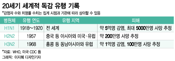 최 교수는 "역사적으로 큰 유행을 일으켰던 인플루엔자는 10~40년 간격으로 있었다"며 "2009년 신종플루 이후 13년 정도가 지났으니 확률적으로는 새로운 인플루엔자가 등장할 시기가 되어가는 것"이라고 전망했다.