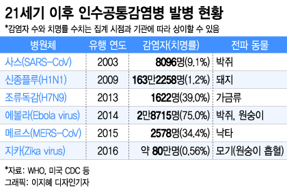 그런데 코로나19만 인수공통감염병인 것이 아니다. 2003년과 2015년 유행한 사스와 메르스는 박쥐에서 기원했고 2009년 신종플루는 돼지에서 발원했다. 질병관리청에 따르면 20세기 이후 발생한 신종 감염병의 75% 이상이 인수감염병이다. 인류를 위협하는 대다수의 감염병은 동물에서 오고있다고 보면 된다.