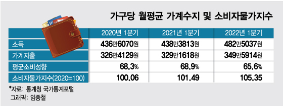 코로나19(COVID-19) 사태 발생 후 지난 2년 동안 우리나라 가구당 월평균 씀씀이는 24만원 늘었지만 급격히 오른 물가를 고려하면 사실상 지출은 제자리걸음을 한 것으로 평가된다. 각 가정에서 늘린 소비는 대부분 '먹고 사는 데' 필수적인 부분이었고 '놀고 즐기는 데' 대한 지출은 오히려 줄었다. 각 가구가 쓸 수 있는 돈 가운데 실제로 상품·서비스 구입에 얼마나 지출했는지를 나타내는 평균소비성향은 올해 1분기 역대 최저를 기록, '꽉 닫힌 지갑'이 통계로 증명됐다.