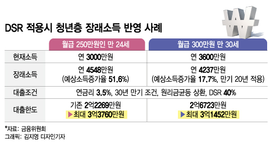 예건대 월급이 250만원인 만 24세 근로자가 30년 만기 주택담보대출(금리 3.5% 기준)을 받을 때 DSR 40%를 적용하면 대출한도는 2억2269억이지만 장래소득을 반영하면 최대 3억3760만원으로 51.6% 늘어난다. 같은 조건에서 월급 300만원인 만 30세 근로자는 대출한도가 2억6723만원에서 최대 3억1452만원까지 증가한다.