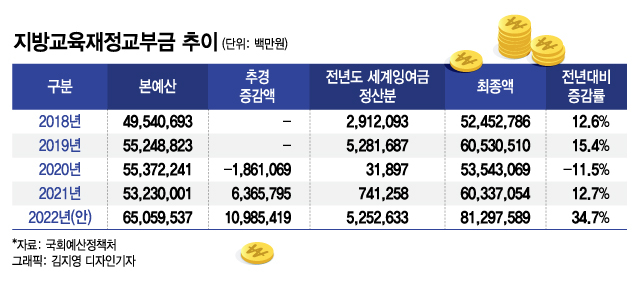 올해 본예산에 약 65조원으로 편성된 교육교부금은 추가경정예산안에서 약 81조원까지 늘었다. 세수추계 실패와 전년도 세계잉여금 정산분이 반영된 결과다. 학령인구 감소와 맞물려 교육교부금의 규모가 과도하다는 주장이 나오는 이유다.